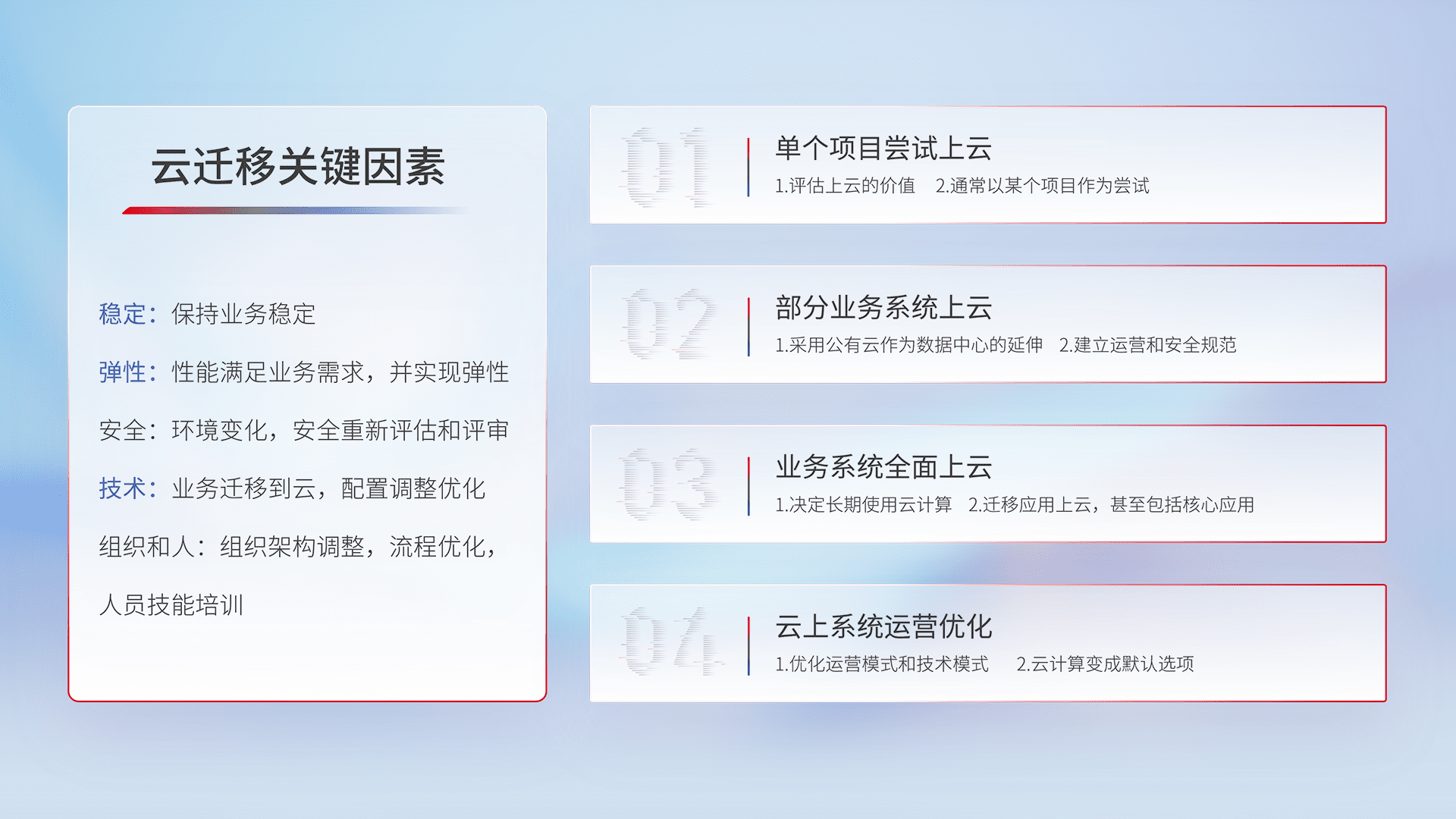 结合实际业务,,,从规划设计、、云平台选型、、云原生改造、、、数据迁移、、、、集成交付,,迁移全过程为客户识别最佳上云路径,,,做好风险识别管理,,,,设计网络架构、、、身份权限、、安全审计合规、、、、操作审计、、日志审计、、监控告警策略、、、、多站点容灾设计等,,,,对云上基础设施进行整体规划,,,提升IT治理水平,,,以满足弹性、、、高可用、、高性能的需求。。