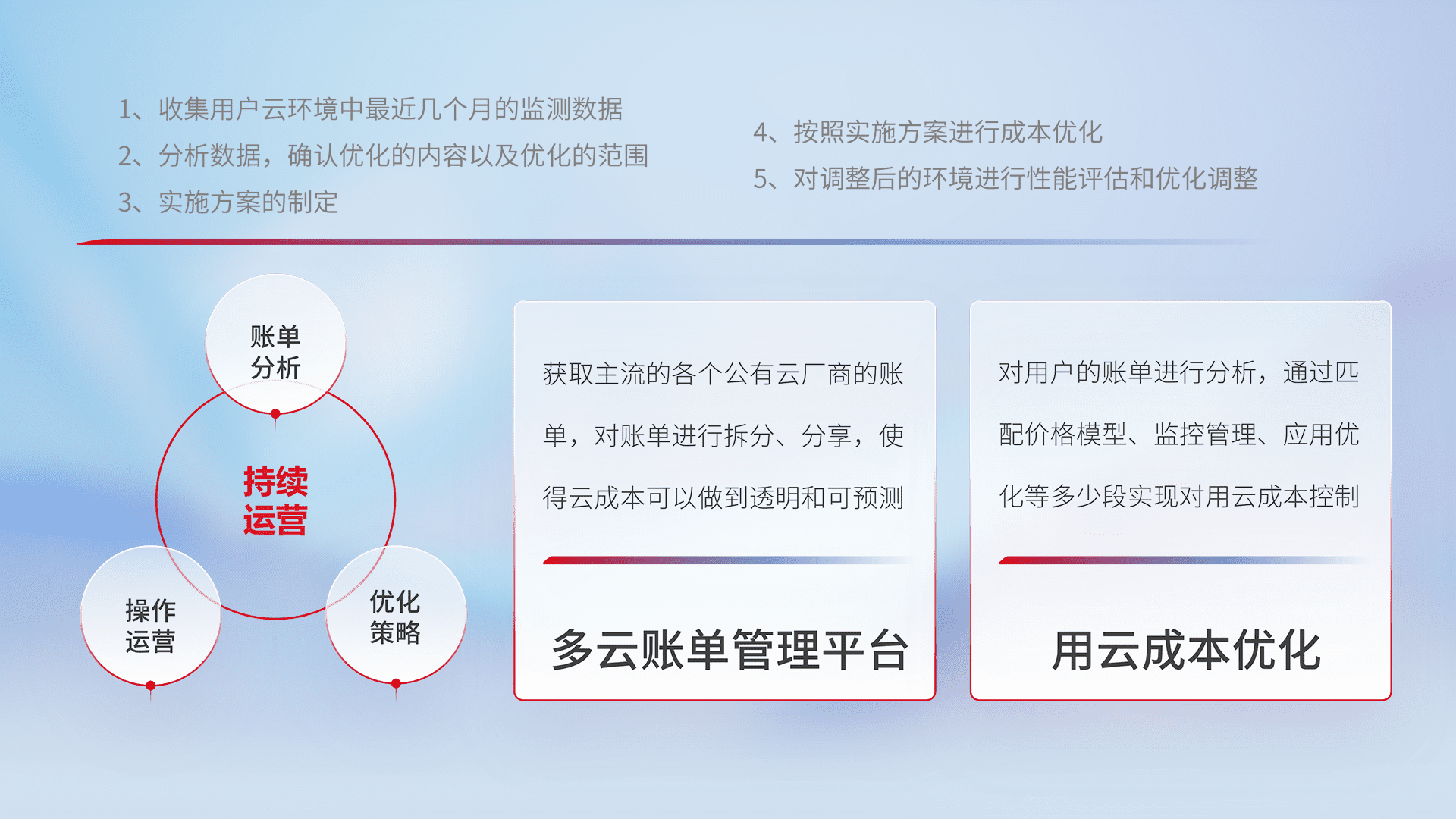 通过多云纳管,,以统一的资源数据模型把客户的云资源进行抽象和封装,,,进而实现对多云资源的统一操作,,保障云资源管理的可靠性、、稳定性与可用性。。量身定制化运维内容,,,,配置、、、开发运维、、、、补丁管理、、、备份、、、、监控、、、、认证和访问管理、、、审计和日常巡检等,,,保障在用云过程中的可靠度,,,稳定度以及高可用率。。